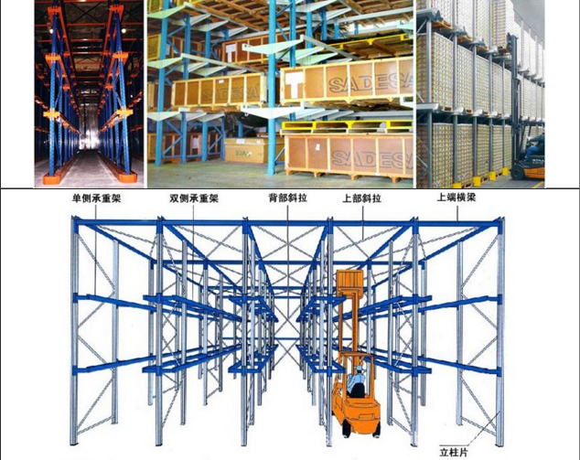 駛?cè)胧截浖?/span>由于存儲(chǔ)貨物比較密集,穩(wěn)定性要求極高,因此所需要的配件比較多,通過(guò)配件與貨架立柱片的連接,讓貨物能夠安全的存放在導(dǎo)軌上。駛?cè)胧截浖艿闹饕浼校号M龋ò▎闻M?、雙牛腿)、導(dǎo)軌、頂橫梁、背橫梁、頂拉桿、背拉桿、后梁、護(hù)柱等等,而這些配件在駛?cè)胧截浖艿慕Y(jié)構(gòu)中分擔(dān)著不同的功能,比如牛腿是立柱片和導(dǎo)軌件的主要連接件;而導(dǎo)軌是則是貨架存放的主要支撐等等,從而形成了駛?cè)胧截浖艿恼麄€(gè)系統(tǒng)。